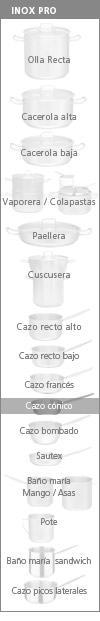 Cazo cónico. Cuerpo en acero inoxidable 18/10 con triple fondo difusor (inox-alu-inox). Pulido satinado interior y exterior uniforme. La tapa se puede comprar a parte.
