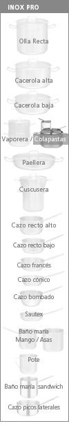 Cacerola + 4 colapastas Inox-Pro. Parte superior e inferior con las mismas medidas. Cuerpo en acero inoxidable 18/10 con triple fondo difusor (inox-alu-inox). Pulido satinado interior y exterior uniforme. La tapa se puede comprar a parte.