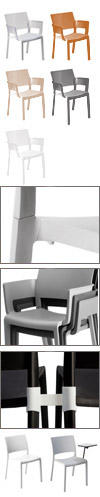 Inyectado en polipropileno. Asiento y respaldo fabricados en dos piezas encajables.