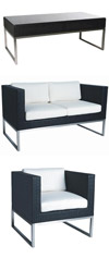 Ratán sintético con estructura aluminio. Patas acero inox. de 25 x 25 mm de 1,2 mm de grosor. Trenzado PE plano 1,4 mm de grosor, gris antracita. Cojines desenfundables. Cremallera color crudo.