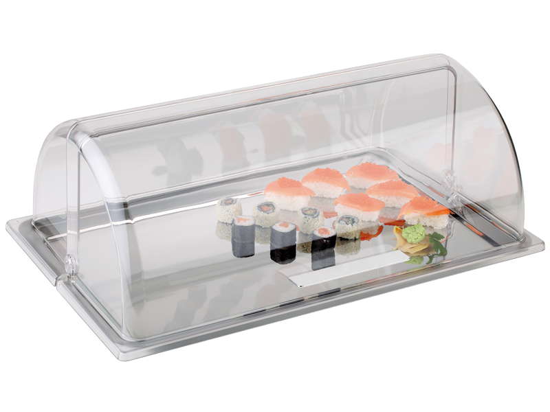 Tamaños GN 1/1 y GN 1/2. Transparente. Asa cromada. Fabricadas en SAN. Apilable y lavable en lavaplatos. Altura 20 cm.