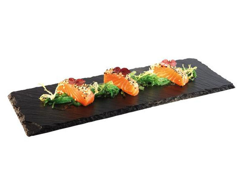 Bandejas de pizarra natural selladas con barniz transparente apto para uso alimenticio.