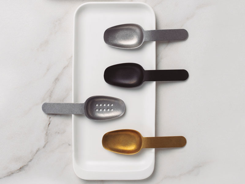 Inox 18/10 con 4 acabados distintos. 7,1cm. Las cucharas degustación completan todo el conjunto de LES ESSENCES, configurándose como una propuesta moderna y sofisticada a la altura de las presentaciones más exigentes.