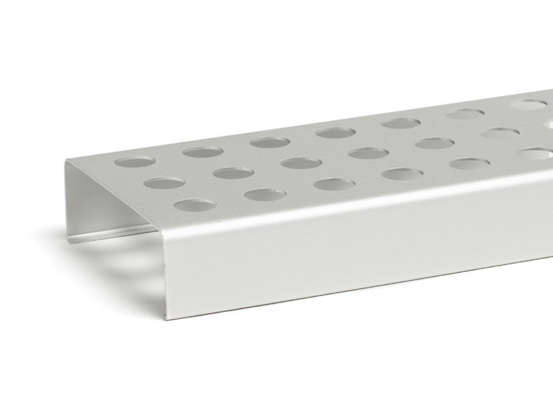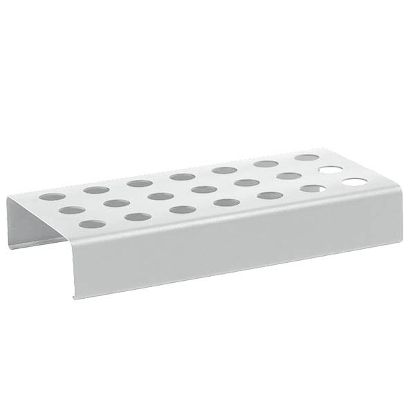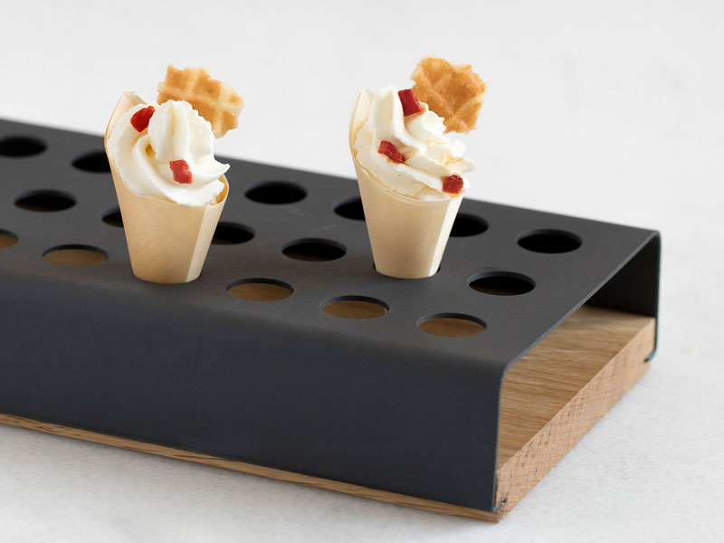 Aluminio pintado en negro o color plata. Medidas 24 x 12 x h4 cm. Soporte con 24 agujeros para conos. Se complementa con una bandeja ranurada de roble de 24 x 12 x h1 cm. Línea LES ESSENCES, soportes y bandejas para los bufés más sofisticados. Aluminio con recubrimiento antiadherente.