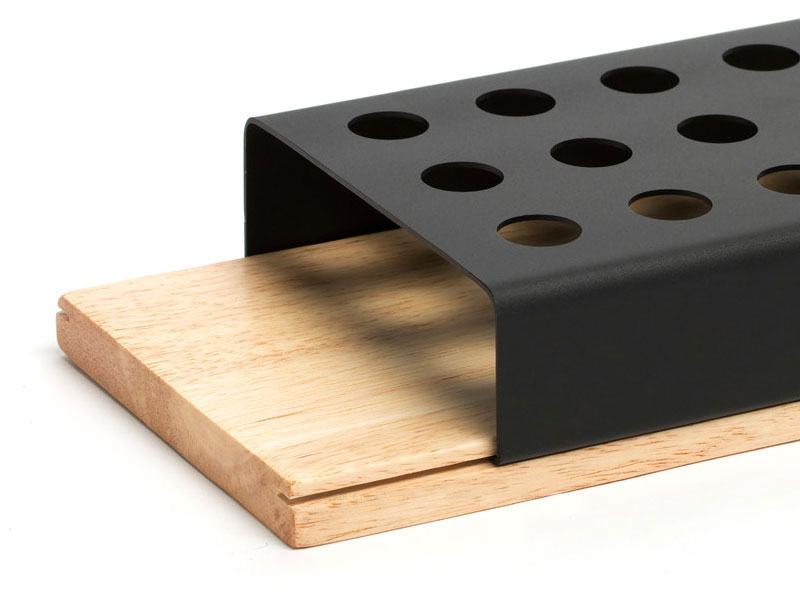 Aluminio pintado en negro o color plata. Medidas 24 x 12 x h4 cm. Soporte con 60 agujeros para piruletas. Se complementa con una bandeja ranurada de roble de 24 x 12 x h1 cm.