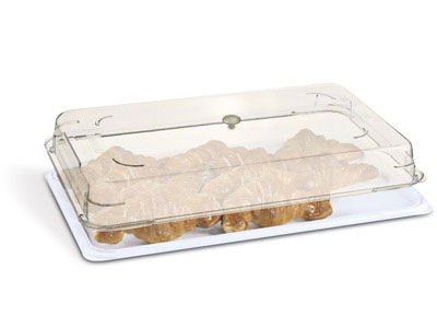 Compuesto por una bandeja blanca y una cubierta transparente. Apilables hasta 1 metro de altura. Cierre por clip. Texturizado antirayado.
