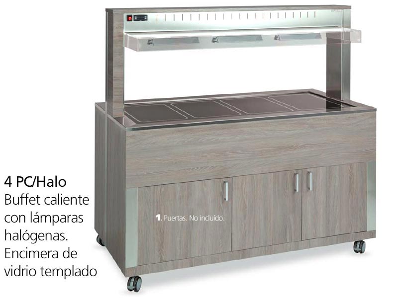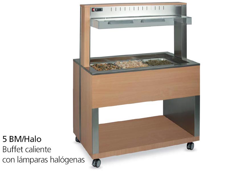 Baño maría con lámparas halógenas (BMH): con lámparas halógenas con interruptor de iluminación independiente, luz blanca.Cúpula fija. Pozo de 26cm de profundidad con llave de drenaje. Baño maría y termostato digital. Iluminación con LED. Dos ruedas con freno incluido. No incluye cubetas GN.
