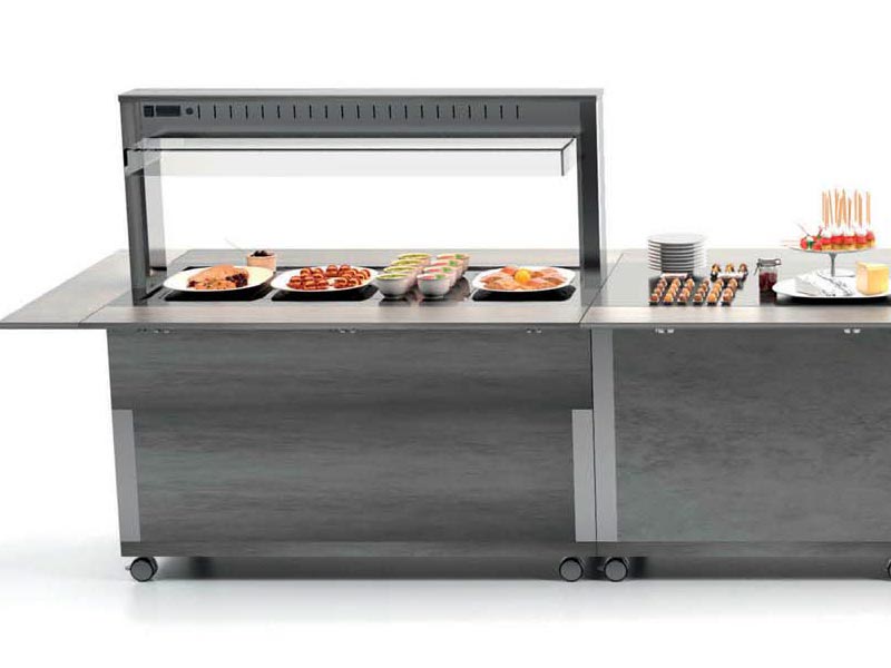 Gama de buffet moderno en madera laminada (12 acabados) y acero inoxidable. Permiten la presentación de alimentos fríos y calientes y pueden ser completado por varias opciones y componentes. Cada elemento puede ser utilizado individualmente, como una isla, o en línea creando flujos libres individuales o espacios de autoservicio.