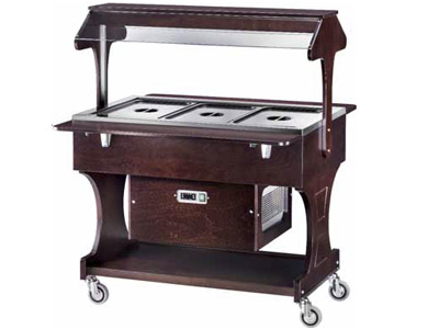 Madera laminada. Tapa Plexiglass con doble abertura. Termostato digital (+2 a +8ºC). Ruedas Ø125mm, dos con freno. Capacidad: 3GN 1/1.