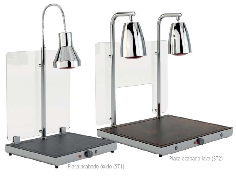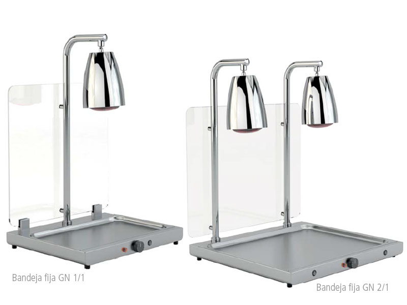 Con 2 lámparas de brazo fijo: 1.250 W. Medidas 66 x 63 x h82 cm. GN 2/1. Placas calientes con lámpara infrarrojos. Placa con termostato (30/90ºC) y luz indicadora. Estructura acero inoxidable.