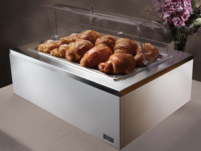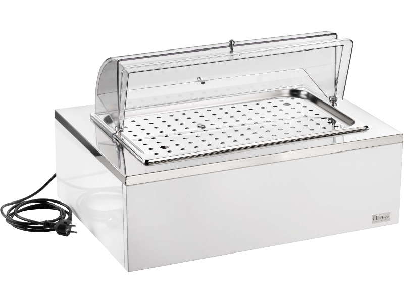 Compuesto por: 1 bandeja GN 1/1 h 20 mm con horquillas y ganchos, 1 fuente GN 1/1 h 40 mm, 1 doble fondo perforado GN 1/1, 1 resistencia eléctrica 40 W, 1 campana rectangular abatible de policarbonato, 1 base alta MDF con plancha superior en acero. Medidas 64 x 46 x altura 39 cm.