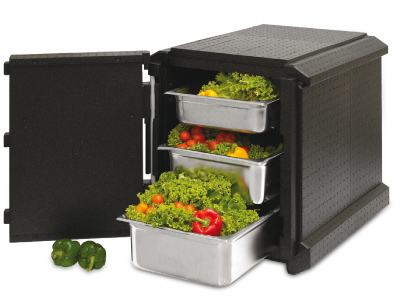 Contenedor de apertura frontal. Para cubetas GN 1/1 o inferiores. Asas laterales. Se puede abrir incluso cuando está apilado.