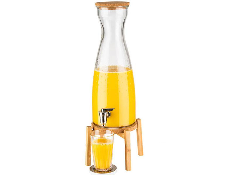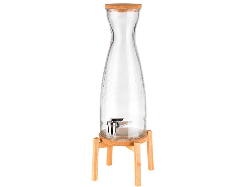 Recipiente con grifo de acero inoxidable y tapa de corcho. Cristal sólido Incluye pie de madera y posavasos de corcho. NO APTO PARA ZUMOS CON PULPA