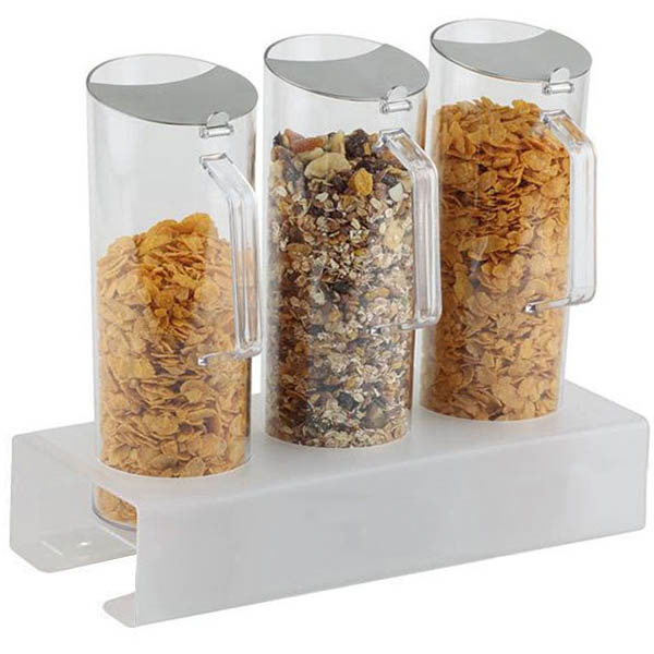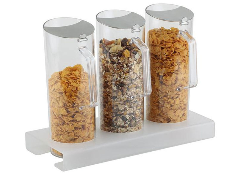 Dispensador triple para cereales Cereal Bar. Disponible stand con dos alturas diferentes.