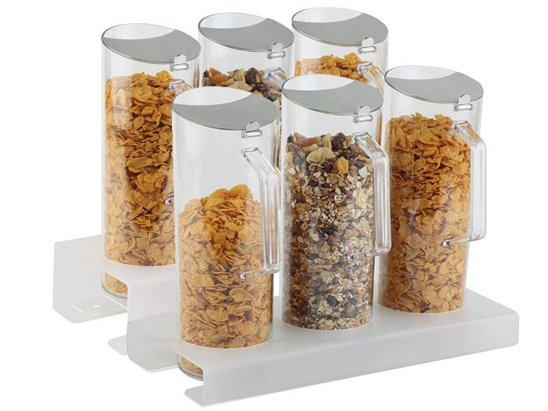 Jarras policarbonato con tapas herméticas y expositores a dos alturas, 4 y 8 cm. Versión doble.