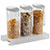 Modelo Triple: Set de 7 piezas: 1 stand, 3 jarras de 1,5 Litros con tapa de solapa de acero inoxidable, y 3 tapas herméticas.