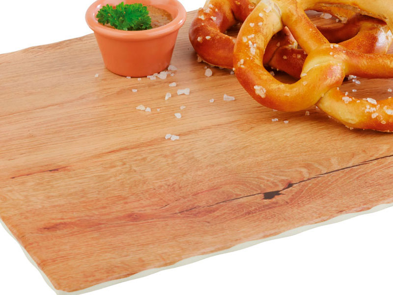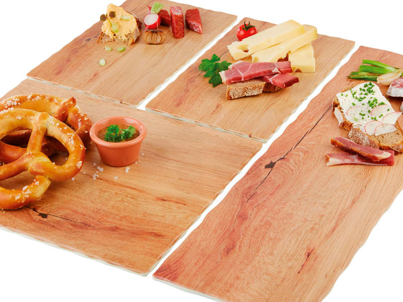 Bandejas de melamina de imitación de materiales naturales. Ofrecen un aspecto elegante y discreto. Pies antideslizantes. Apilables y lavables en lavaplatos.
