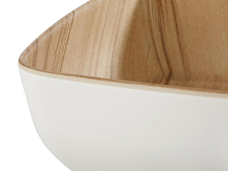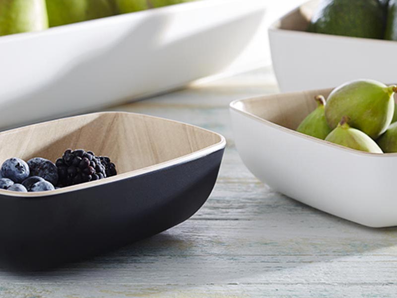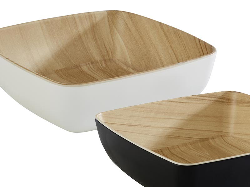 Diseño escandinavo. Estilo sencillo y claro. Apto para lavavajillas. Apilable. Melamina imitación madera en el interior y exterior blanco o negro. Acabado mate.