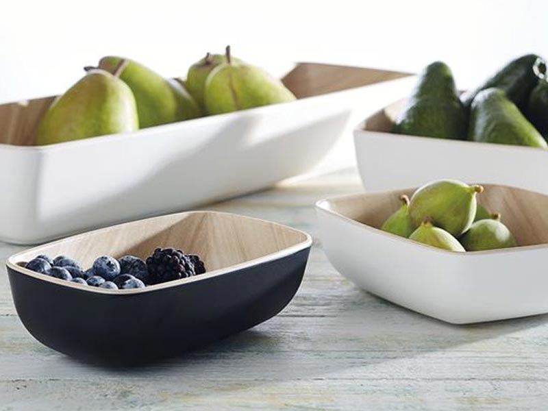 Diseño escandinavo. Estilo sencillo y claro. Apto para lavavajillas. Apilable. Melamina imitación madera en el interior y exterior blanco o negro. Acabado mate.