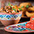 Vajilla de melamina. Los tonos marinos que recuerdan a una taberna griega en el Egeo. Bandejas con pies antideslizantes.