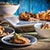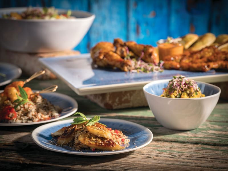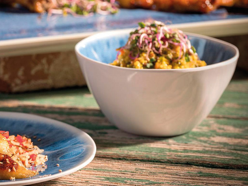 Vajilla de melamina. Los tonos marinos que recuerdan a una taberna griega en el Egeo. Bandejas con pies antideslizantes. MÁXIMO 70ºC.