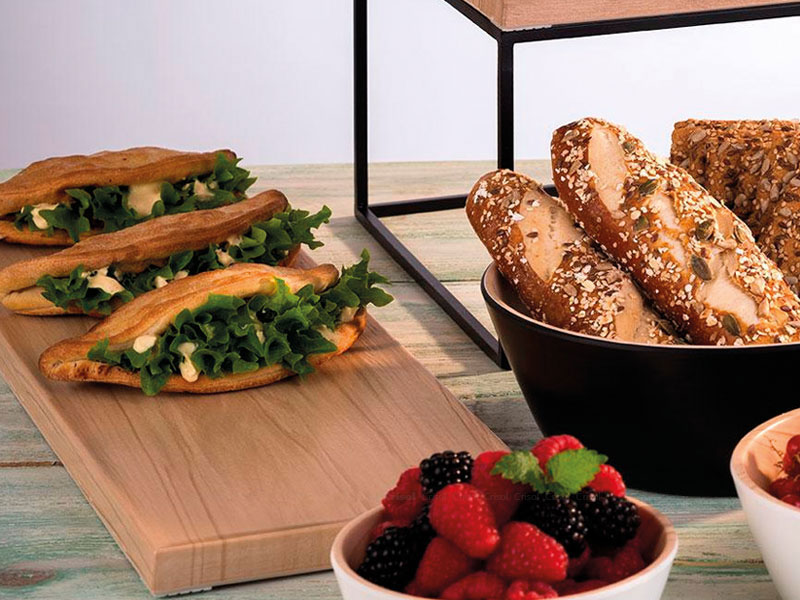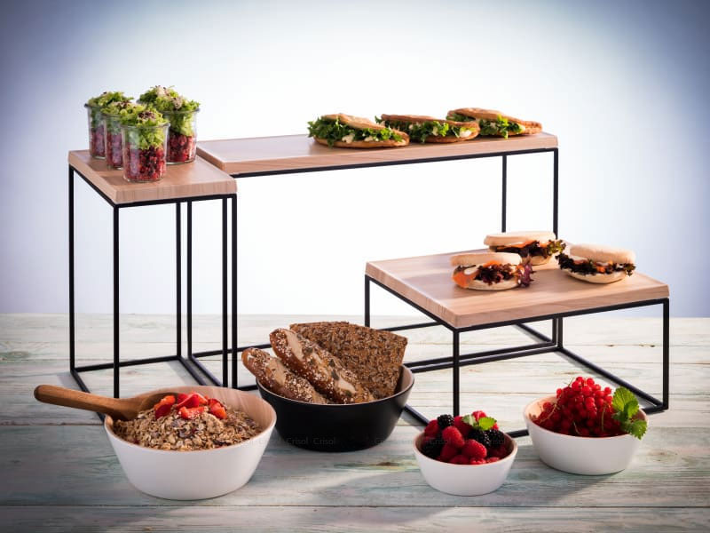 Caja expositora de bambú para la presentación de productos en bufés y eventos culinarios.