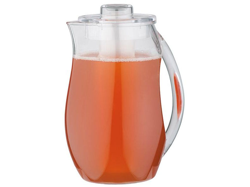 Jarra de zumo con asa. 60% acrílico, 40% poliestireno. Tapa con pomo. Con tubo para hielo.