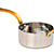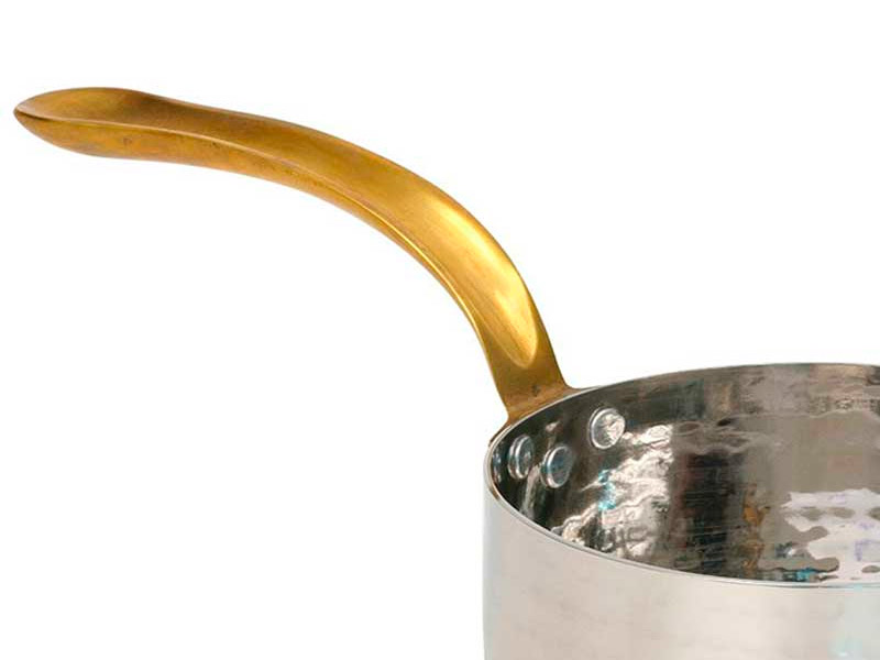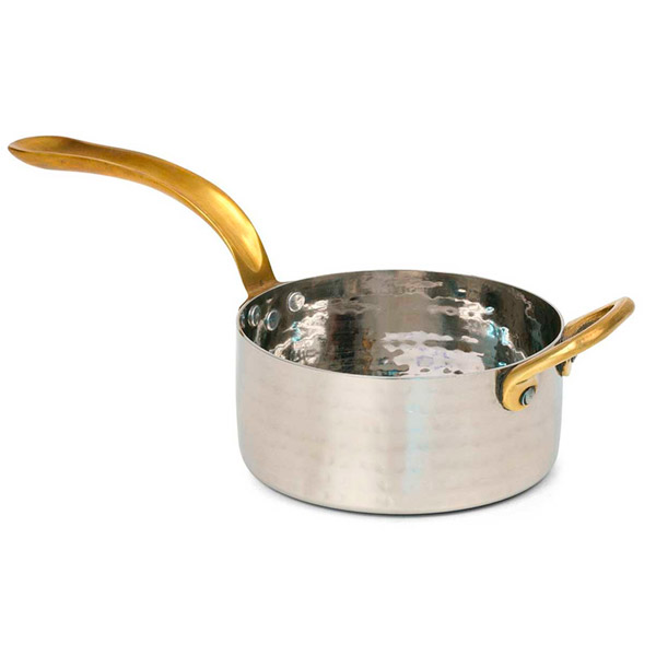 Mini cazo de acero inoxidable. Funcional y elegante. Su mango y asa presentan un distintivo acabado en color oro, sumando un toque sofisticado a la experiencia culinaria. Especialmente indicada para presentaciones, porciones y raciones, realzando la estética de cualquier preparación.