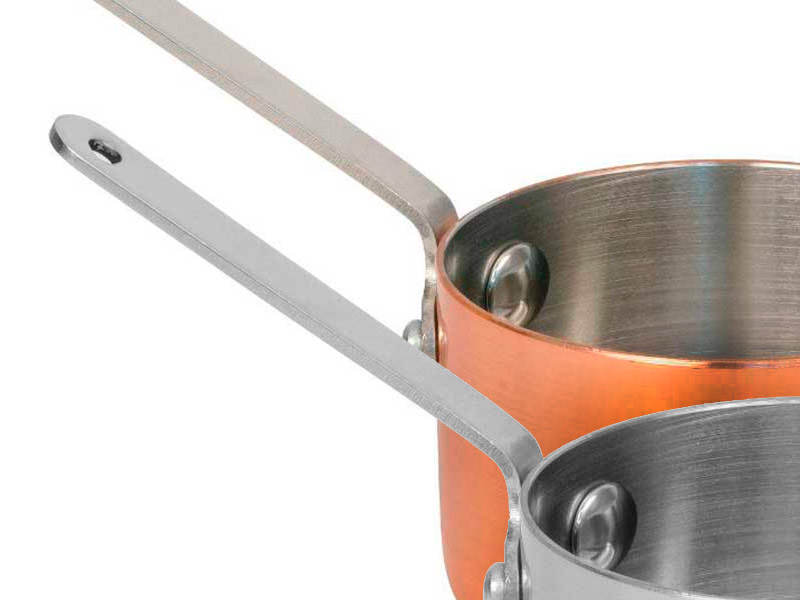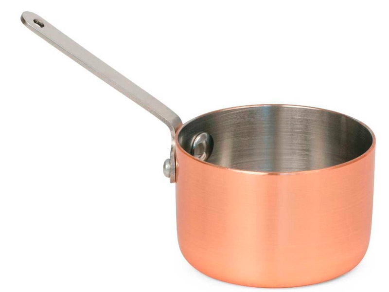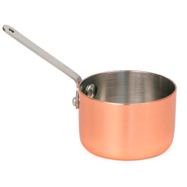 Mini cazo de acero inoxidable. Funcional y elegante. Color inox o color cobre. Su mango y asa presentan un distintivo acabado en color oro, sumando un toque sofisticado a la experiencia culinaria. Especialmente indicada para presentaciones, porciones y raciones, realzando la estética de cualquier preparación.