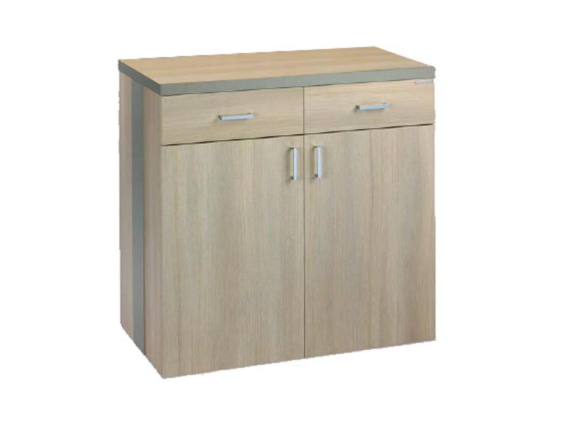Mueble bajo con 2 cajones, 2 puertas y 2 baldas altas. Estilo moderno de madera laminada. Detalles color aluminio. Regulables en altura.