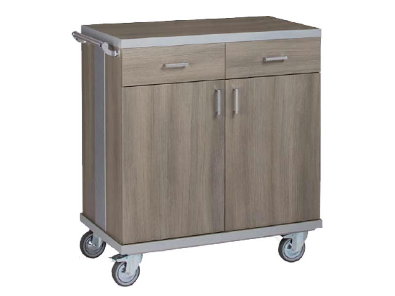 Estilo moderno de madera laminada. Detalles color aluminio. Regulables en altura. Versión estándar con ruedas Ø75 mm o reforzada con asa lateral, base reforzada y ruedas de Ø125 mm.