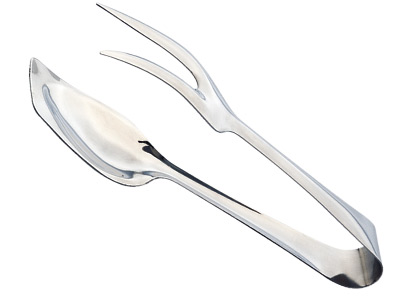 Tenedor monobloc fabricado en acero inoxidable con acabado pulido brillante.