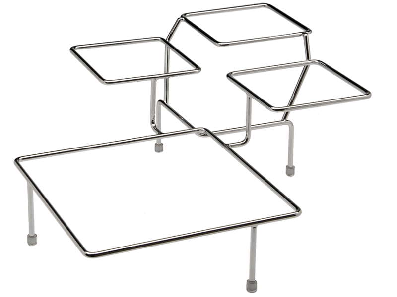 Expositor metálico recto de tres niveles para cestas y bandejas bufé y presentación.