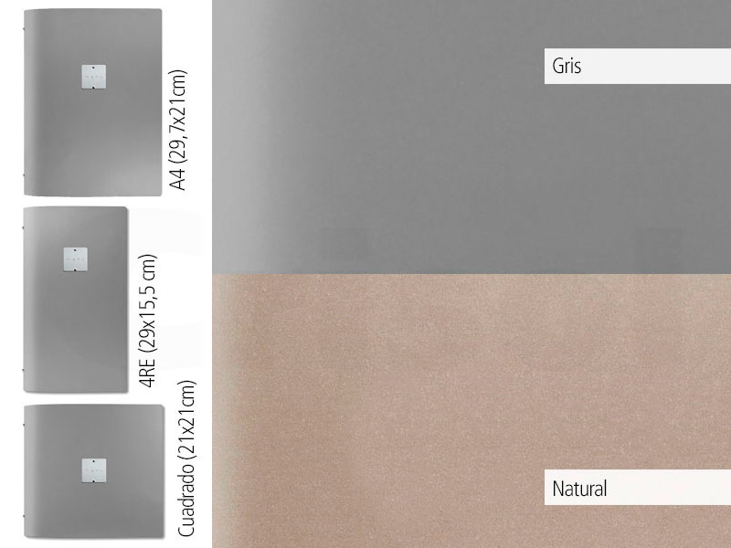 Fabricado en símil piel. Termosellado en crema. 3 solapas transparentes en Renoglass 0,4mm.