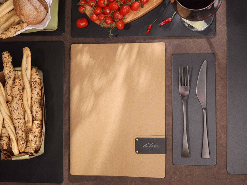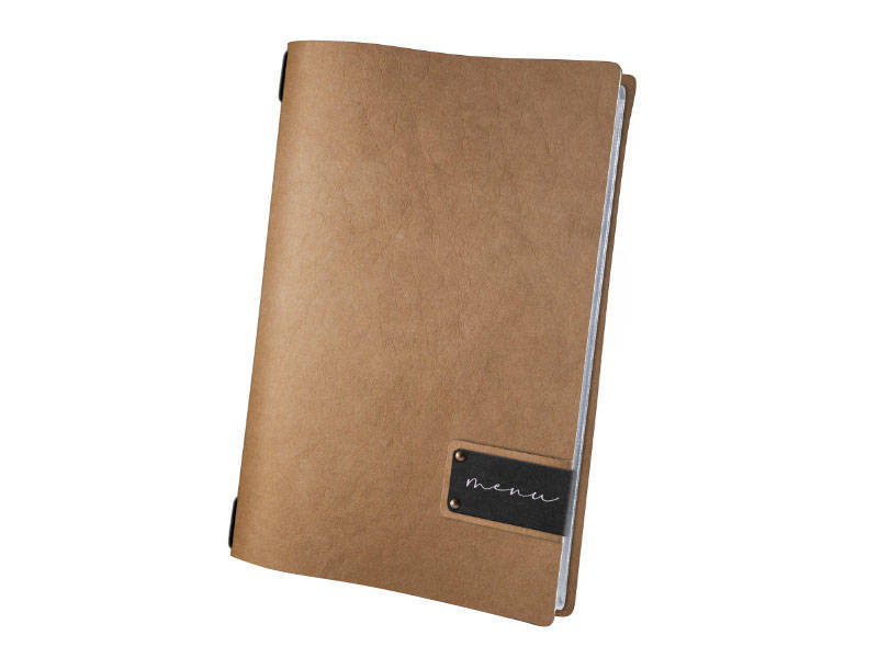 Menú en fibra de celulosa ecológico con portada personalizable con logo o texto. Incluye 1 funda doble (4 hojas)