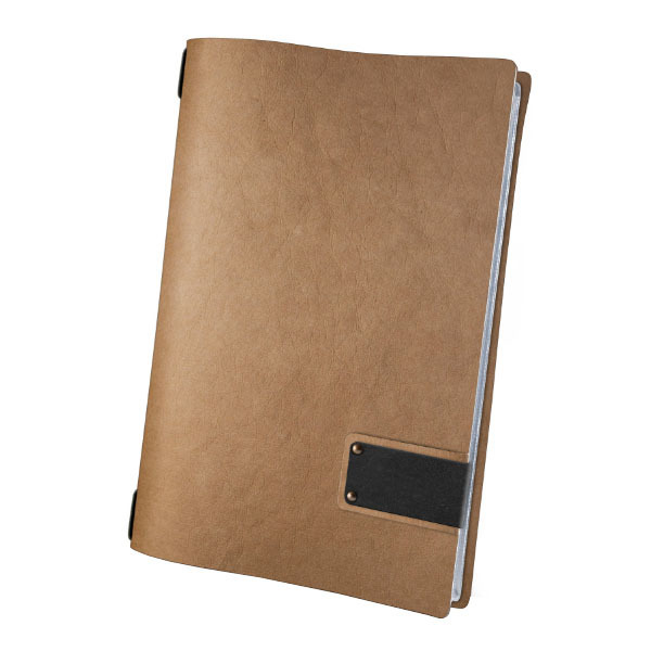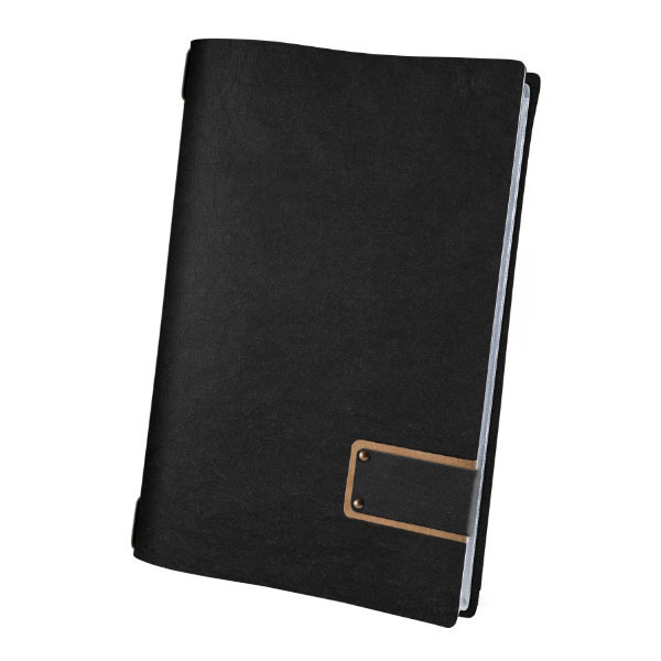 Tamaño 23,2 x 31,8 cm. Cuero genuino regenerado con tratamiento antimanchas. Equilibrio entre materiales naturales y diseño contemporáneo. Para uso intensivo. Cubierta suave y textura en relieve. Incluye 1 funda doble (4 hojas) con elástico negro.
