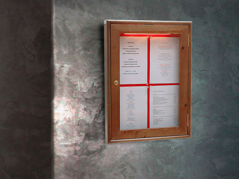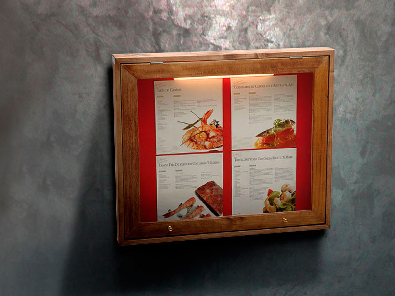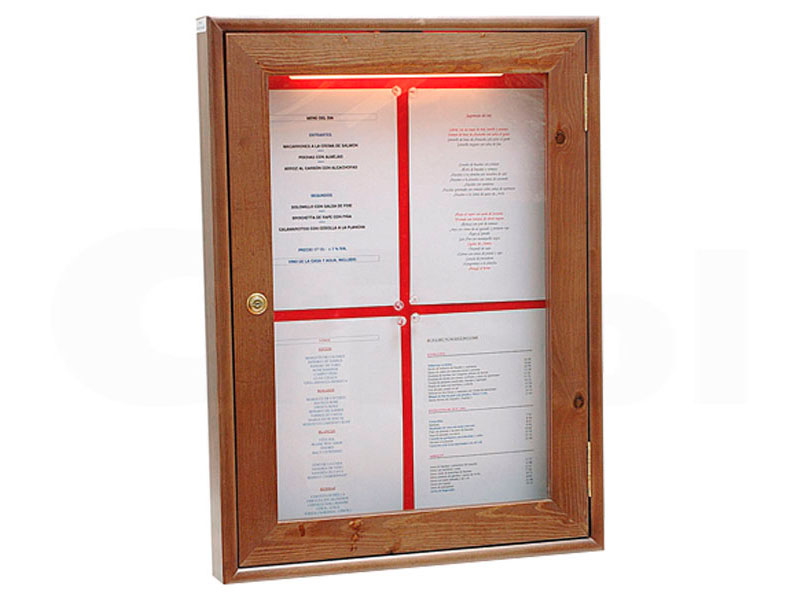 Cubremenús mural una cara sin pie (consultar versión con pie). Madera de pino barnizada. Con iluminación. Modelos en horizontal (H) o en vertical (V).