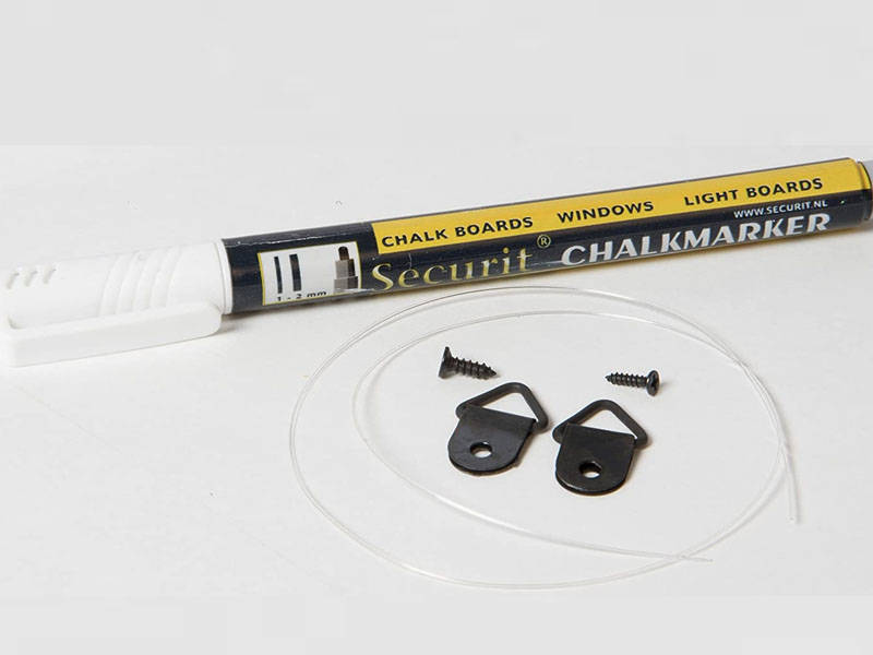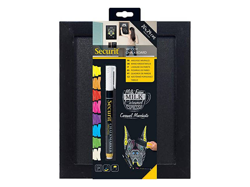 35 x 23 x 6 cm. Pizarras siluetas con base de aluminio. Marcador de tiza líquida incluido.