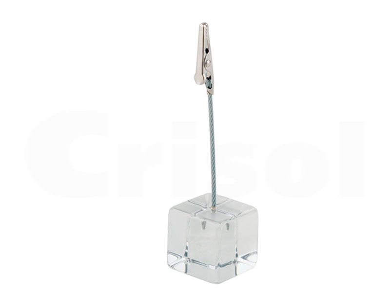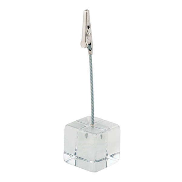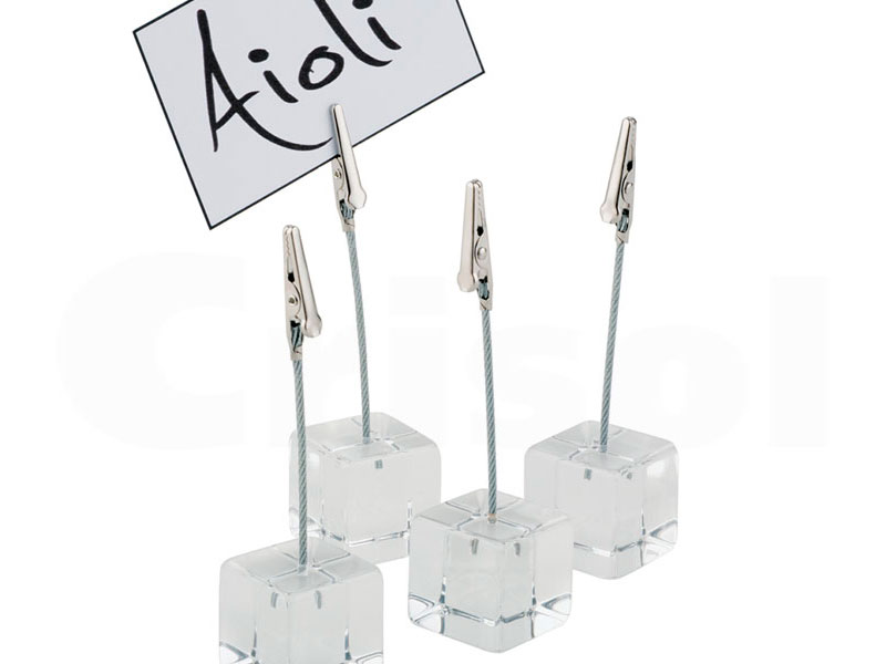 Set de 4 pinzas verticales sobre soporte cubo acrílico. Incluye 20 etiquetas blancas.