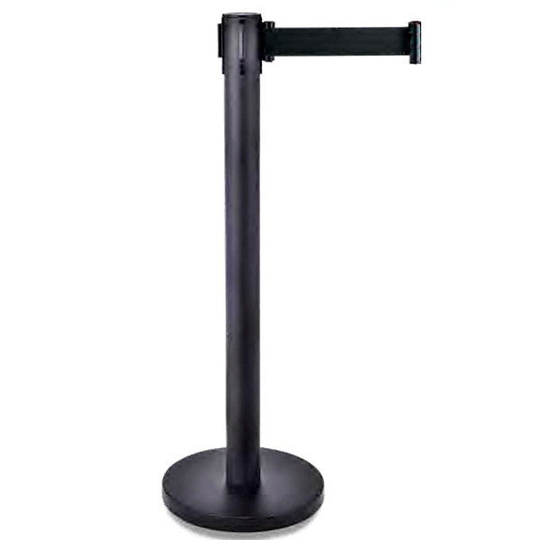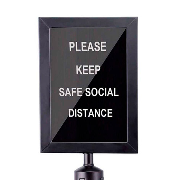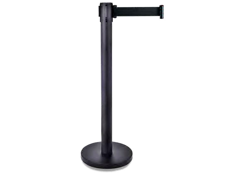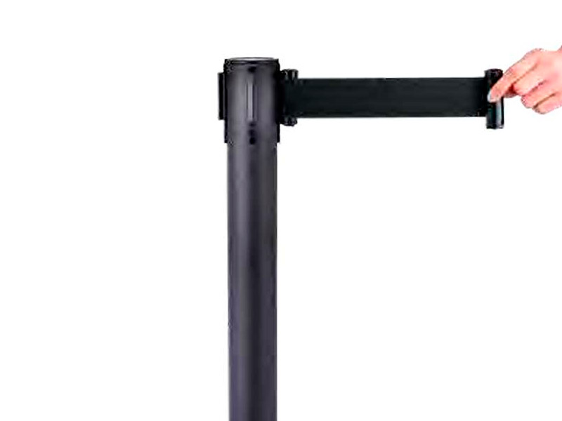 Cinta de 2 metros de color negro. Poste en acero inoxidable pintado de negro. Panel informativo opcional con marco inox para tamaños A4.