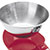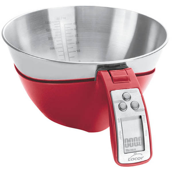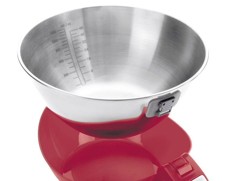 Báscula digital con bol extraíble y marcas de llenado. Bol de acero inoxidable Ø21 cm y 1,5 Litros. Escala de 1 g a 5 Kg. Apertura y cierre deslizante. Display digital y 3 botones.