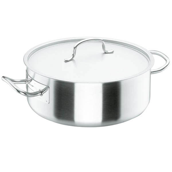 Cacerola baja con tapa Chef Classic. Cuerpo de acero inoxidable 18/10 que ofrece una excelente resistencia a la corrosión y a los ácidos alimentarios y sales. Además su borde extra-grueso reforzado permite un vertido perfecto.