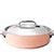 Exterior de cobre liso. Interior de acero inox. Mango y asas de fundición. Borde vierte fácil.
