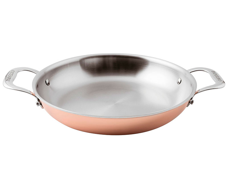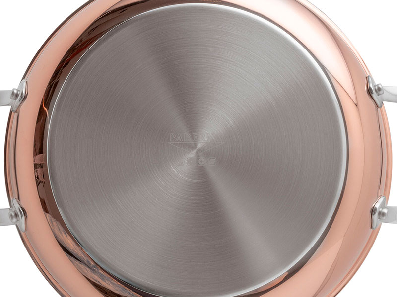 Paellera de la serie 15600 3-PLY. Combina tres metales de alta calidad: cobre, aluminio y acero inoxidable, para ofrecer una cocción uniforme que preserva las propiedades nutricionales de los alimentos.