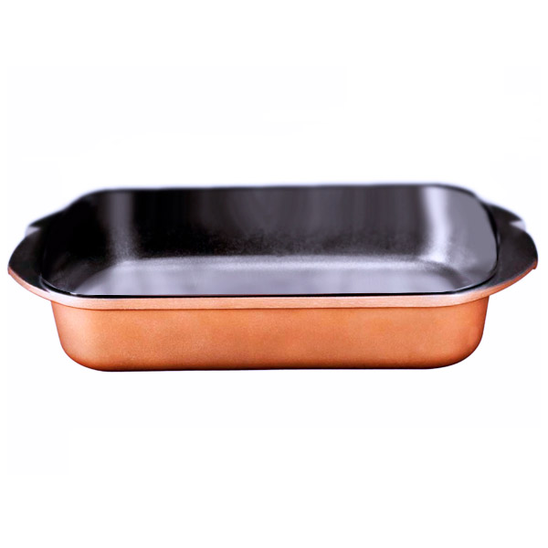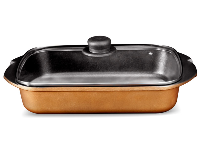 Cazuela baja. Aluminio de fundición de gran resistencia. Exterior pintado en elegante color bronce.