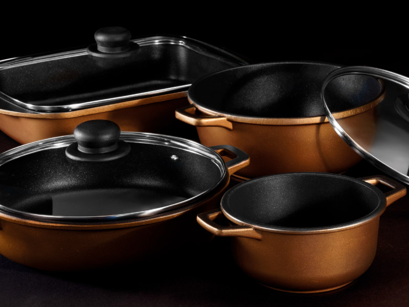 Batería de cocina Bronze. Apta para cocinas a gas, vitro y eléctricas. También puede utilizarse en el horno. Indicada para cocción lenta. Asas integradas monobloque. Fondo torneado.