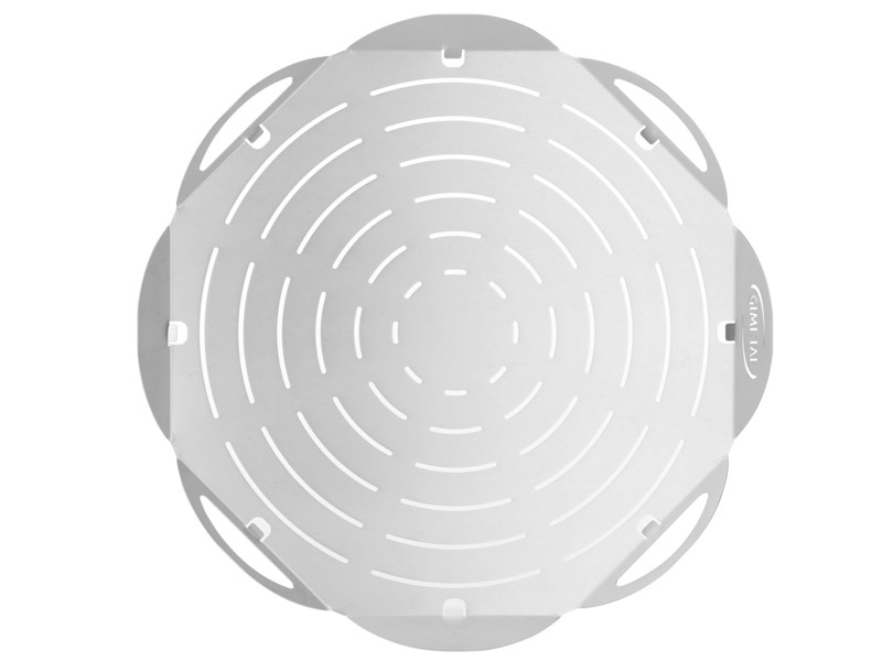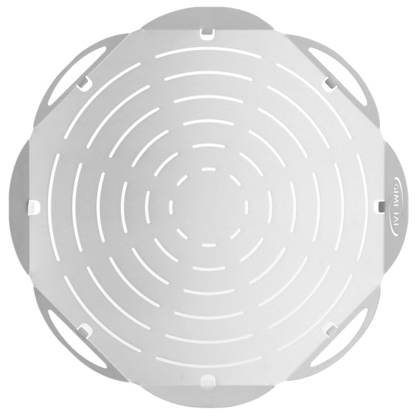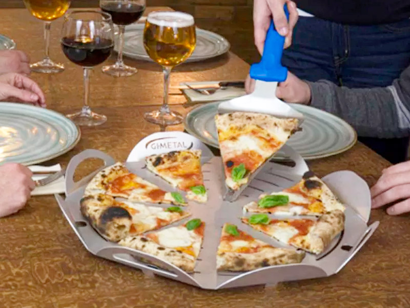Bandeja redonda para presentar pizza o focaccia directamente en la mesa del cliente. Cuenta con almohadillas especiales y una superficie perforada que facilitan la evacuación del vapor y mantienen la fragancia del producto. Está fabricada en aluminio, lo que la hace funcional, práctica y fácil de limpiar.