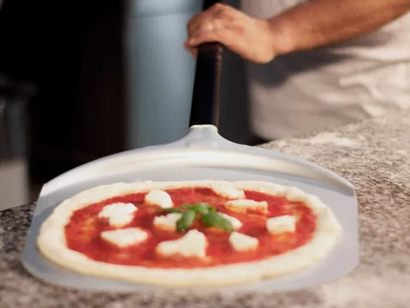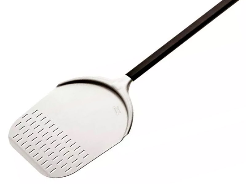 Pala rectangular perforada Alice, diseñada para combinar tradición y funcionalidad moderna. Estructura fuerte y rígida. La pala rectangular asegura una distribución uniforme del peso, ideal para manejar pizzas grandes.