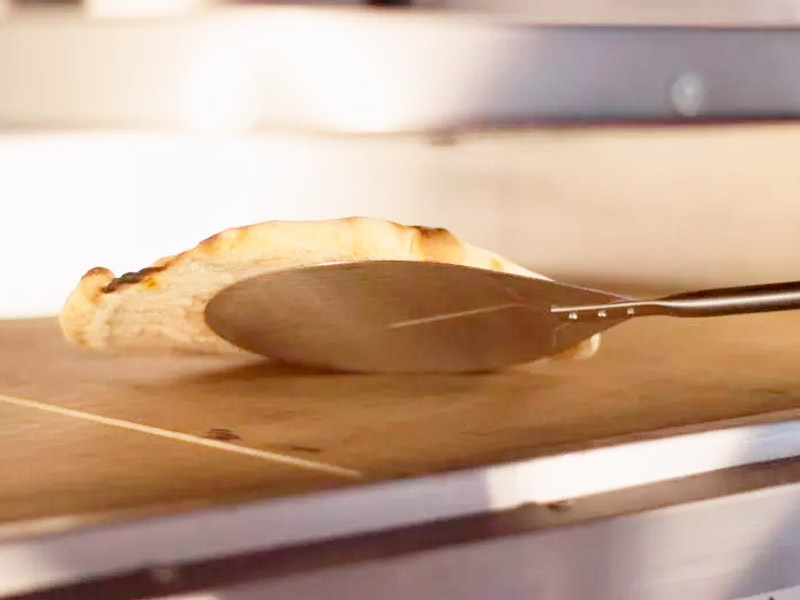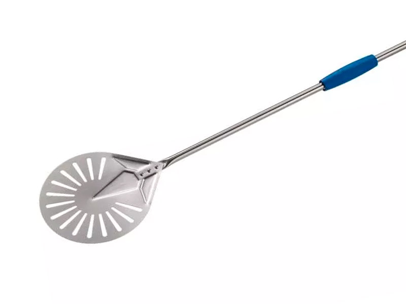 Paletina perforada Azurra. Esta línea se distingue por ofrecer palas y paletinas de alta calidad para pizzaiolos profesionales, combinando ligereza, resistencia y flexibilidad. la Linea Azzurra se posiciona como la opción ideal para el pizzaiolo profesional que busca mejorar la eficiencia, la comodidad y la precisión en su cocina, asegurando al mismo tiempo una durabilidad y un diseño ergonómico superior. Fabricadas íntegramente en acero inoxidable, estas paletinas eliminan la transmisión de calor, lo que aumenta la comodidad durante el uso prolongado.