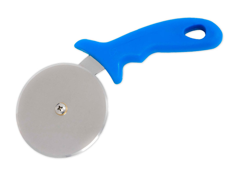 Cortador de pizza con hoja de acero inoxidable, mango de plástico, certificado alimentario.